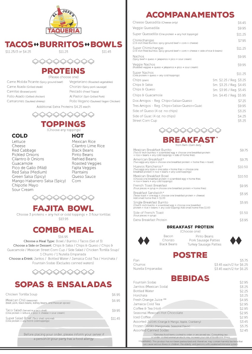 Appetizers are equally tempting, featuring Tres Amigos Chips with salsa, guacamole, or queso – perfect for sharing or indulging solo. With rave reviews highlighting the generous portions and exceptional customer service, diners consistently express their love for the flavorful bowls and fresh ingredients. Whether you're craving a quick bite or a satisfying meal, El Jefe's Taqueria promises a culinary experience that won't disappoint!